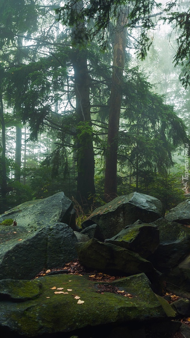 Edytor tapety: Kamienie pod iglastymi drzewami