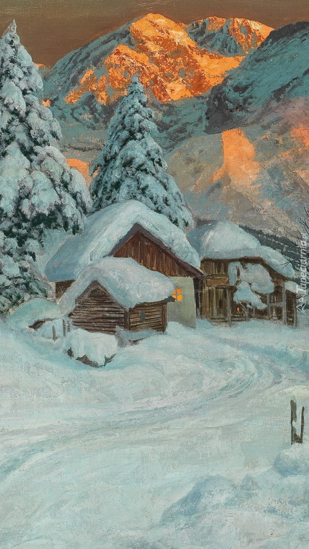Edytor tapety: Ośnieżone domy na obrazie Aloisa Arneggera