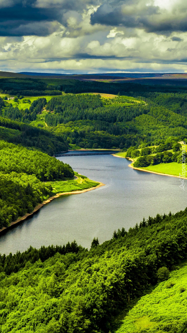 Edytor tapety: Rzeka i pola na zielonych wzgórzach