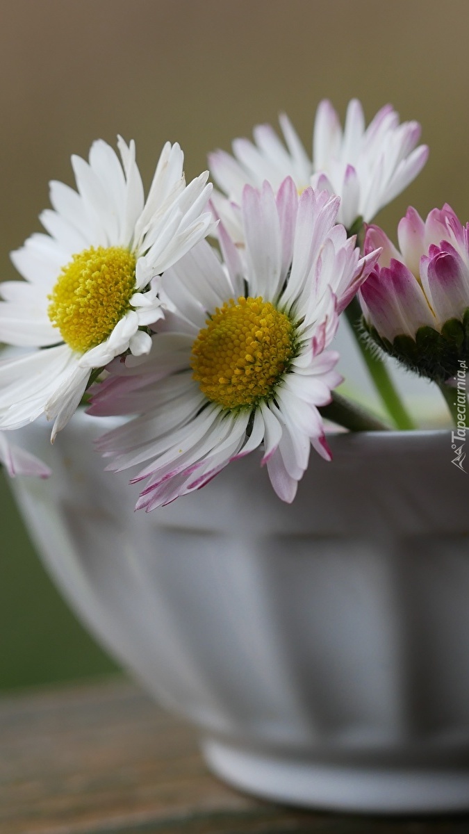 Edytor tapety: Białe stokrotki w miseczce