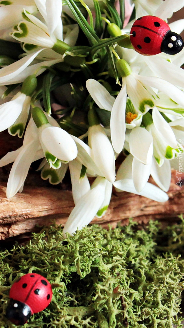 Edytor tapety: Kwiatki przebiśniegi i biedronki