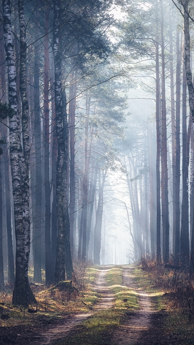 Edytor tapety: Drzewa przy ścieżce w zamglonym lesie