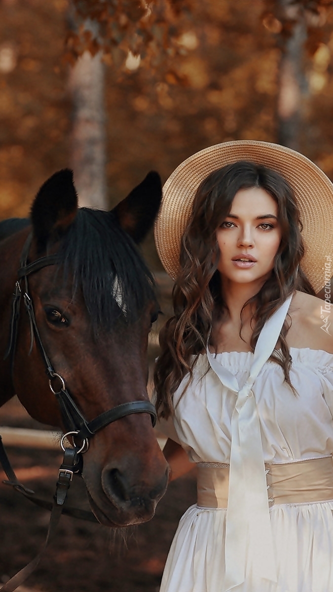 Edytor tapety: Kobieta w kapeluszu obok konia