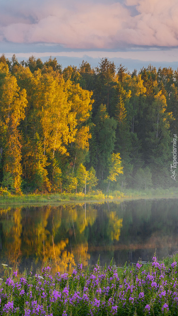 Edytor tapety: Jesienne drzewa i kwiaty nad rzeką