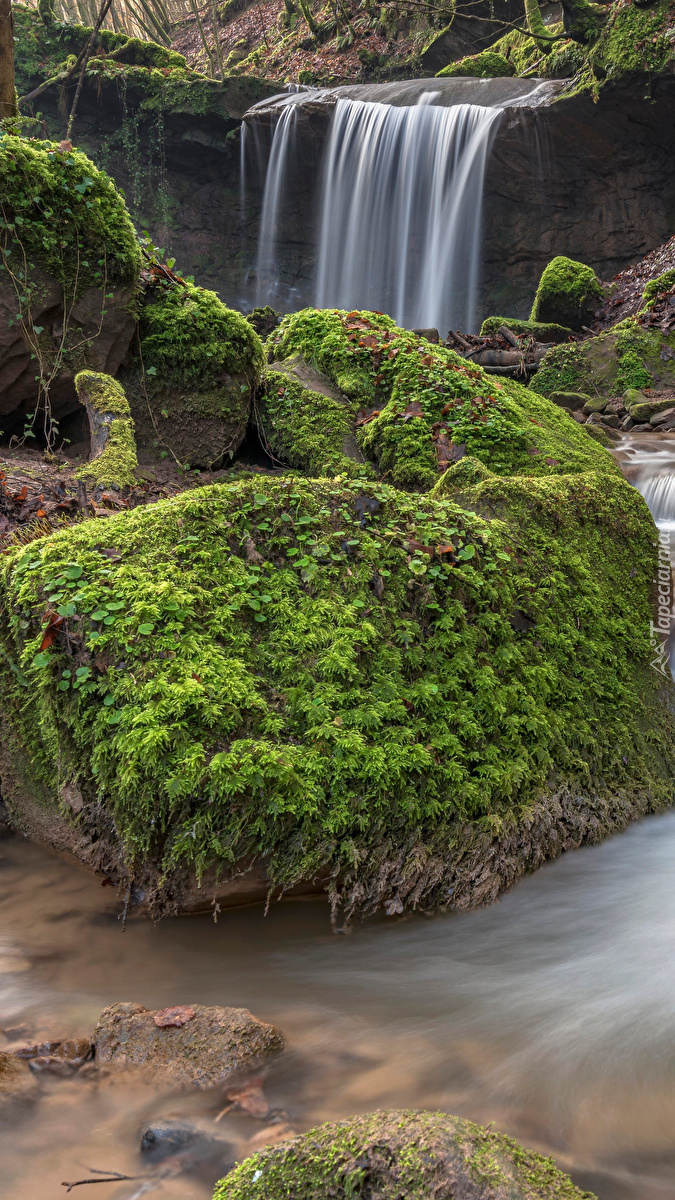 Edytor tapety: Omszałe skały na rzece obok wodospadu