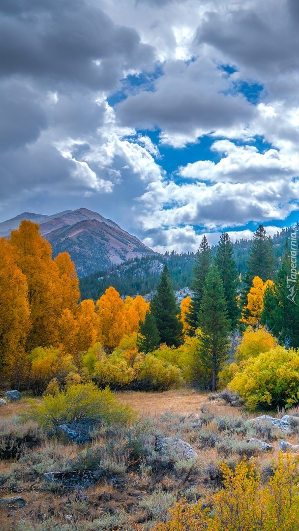 Edytor tapety: Jesienne drzewa i chmury nad górami
