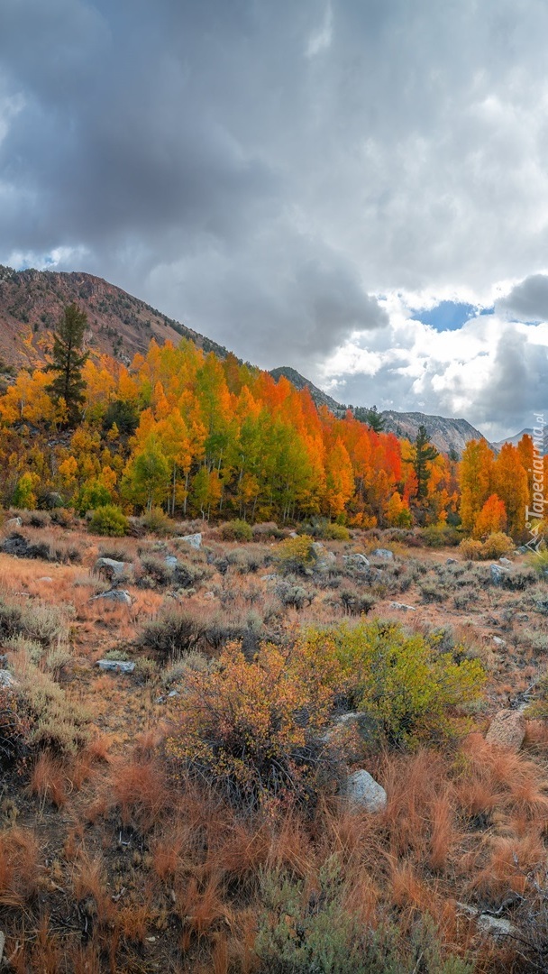 Edytor tapety: Jesienne drzewa w górach pod chmurami