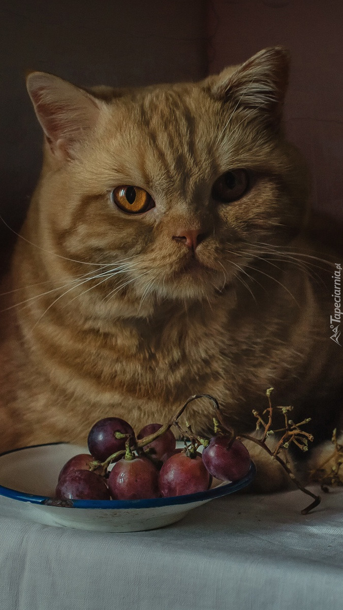 Edytor tapety: Rudawy kot przy misce z winogronem