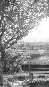 Edytor tapety: Ławka pod drzewem z widokiem na pola