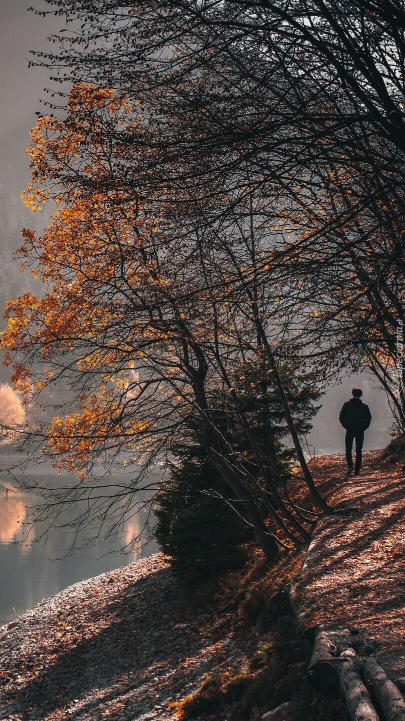 Edytor tapety: Człowiek na ścieżce pod jesiennymi drzewami