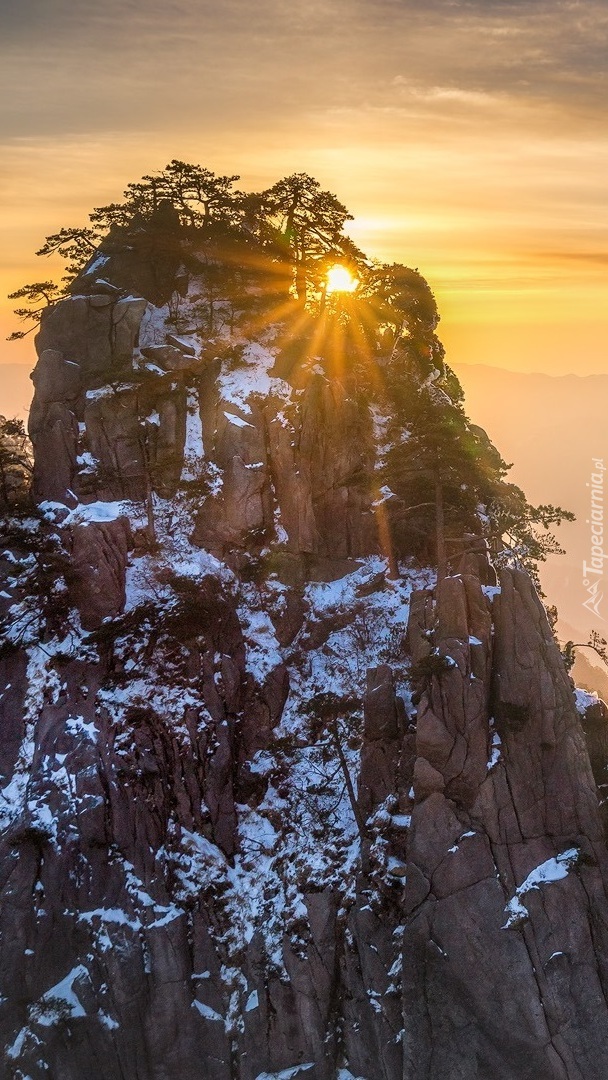 Edytor tapety: Promienie słońca za drzewami na skałach