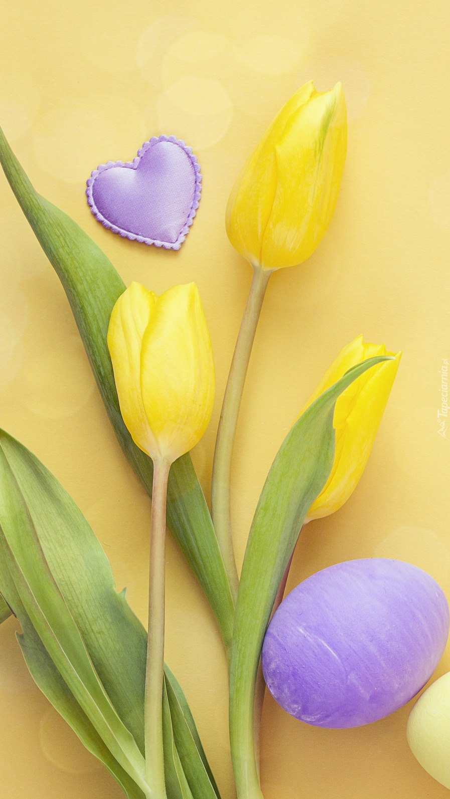 Edytor tapety: Pisanki i serduszko obok żółtych tulipanów