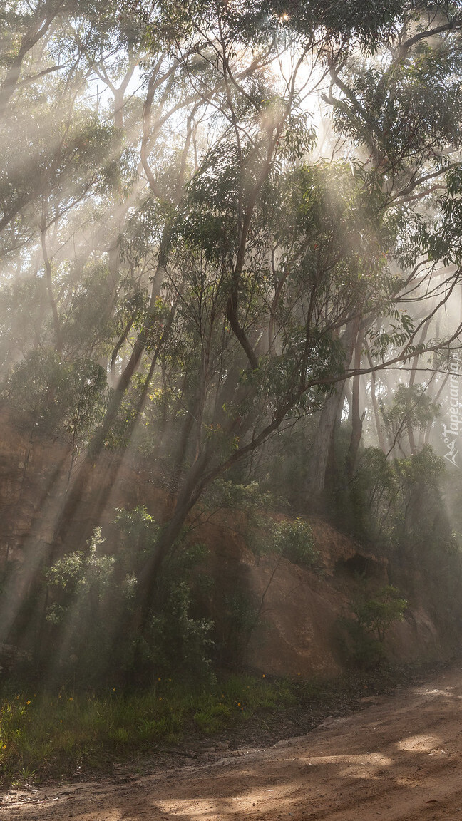 Edytor tapety: Smugi słonecznego światła wśród drzew