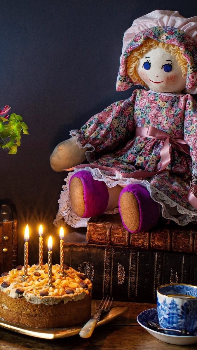 Edytor tapety: Tort obok lalki na książkach