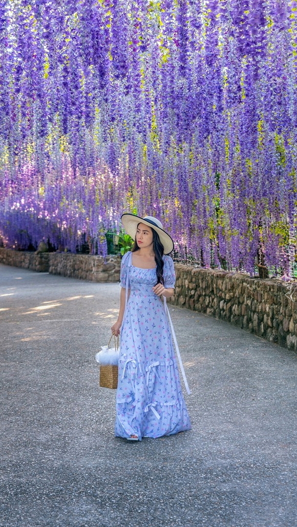 Edytor tapety: Kobieta pod kwiatami glicynii