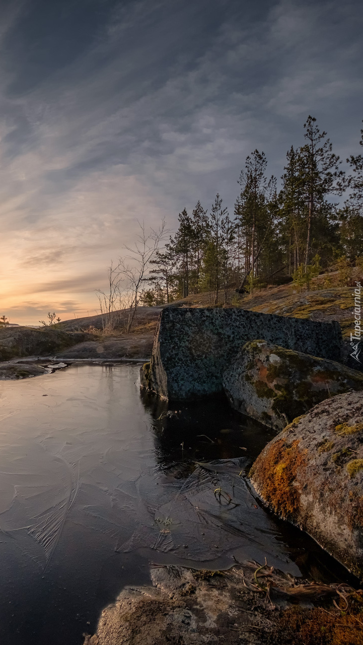 Edytor tapety: Drzewa na skałach nad jeziorem