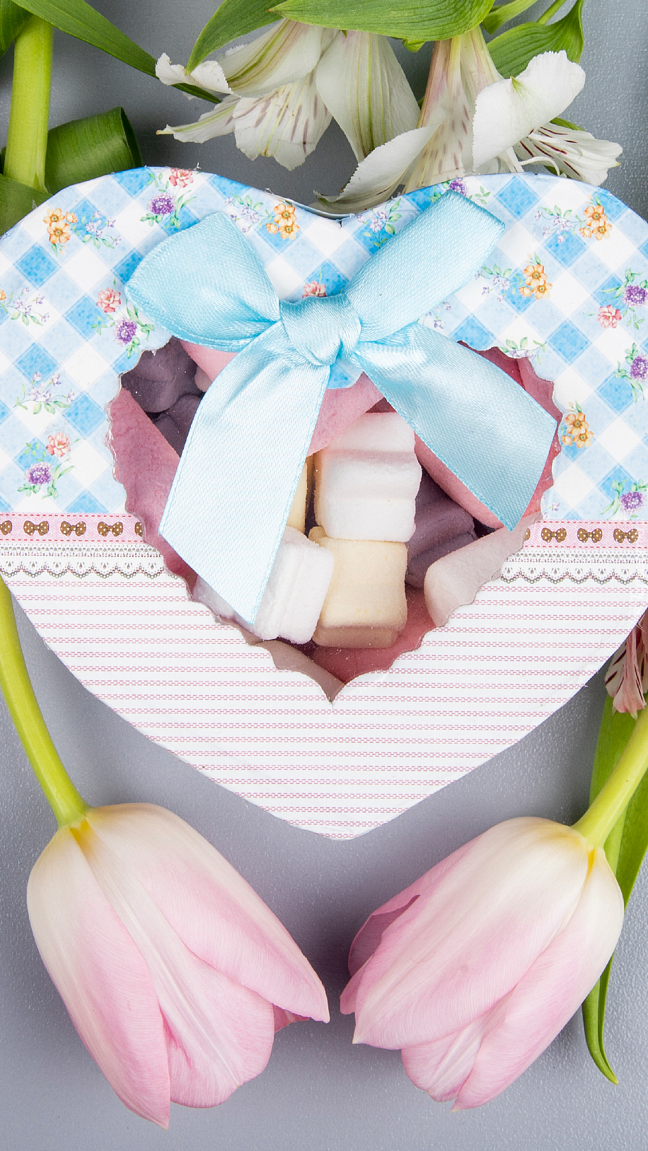 Edytor tapety: Pudełko w kształcie serca na tulipanach