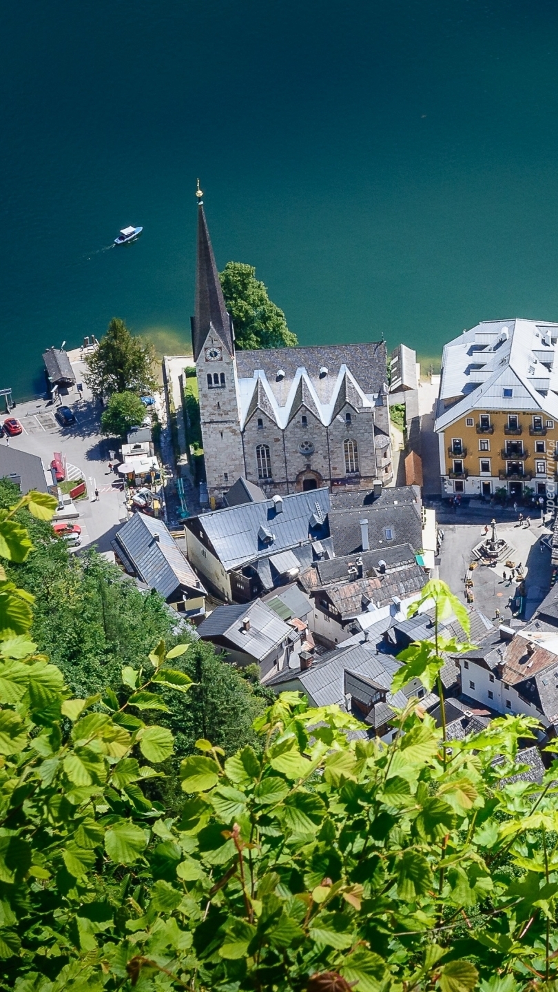 Edytor tapety: Domy i kościół nad jeziorem Hallstattersee