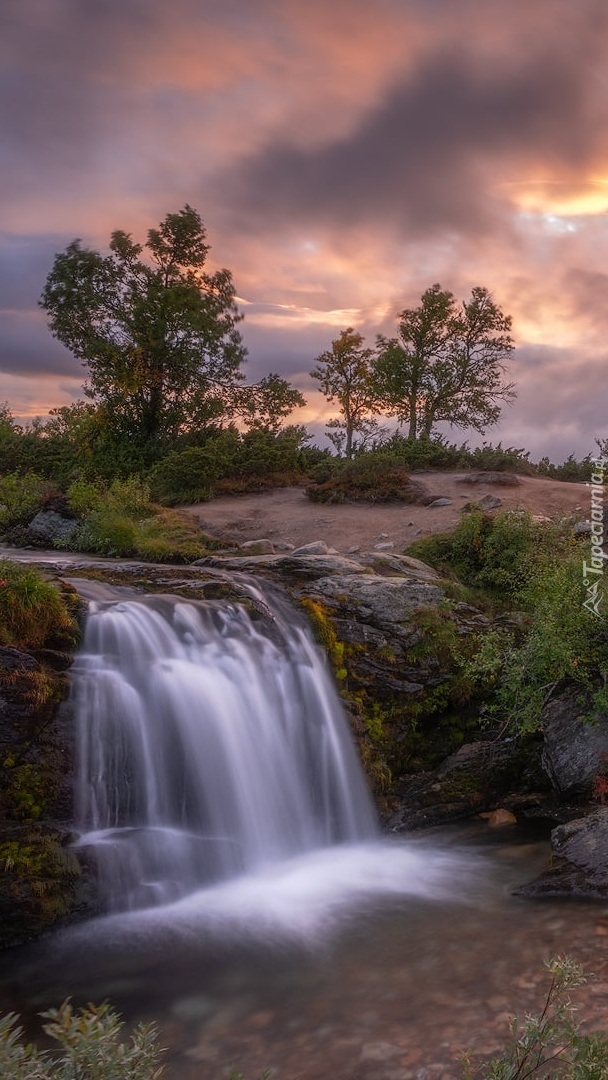 Edytor tapety: Drzewa obok wodospadu na małej rzeczce