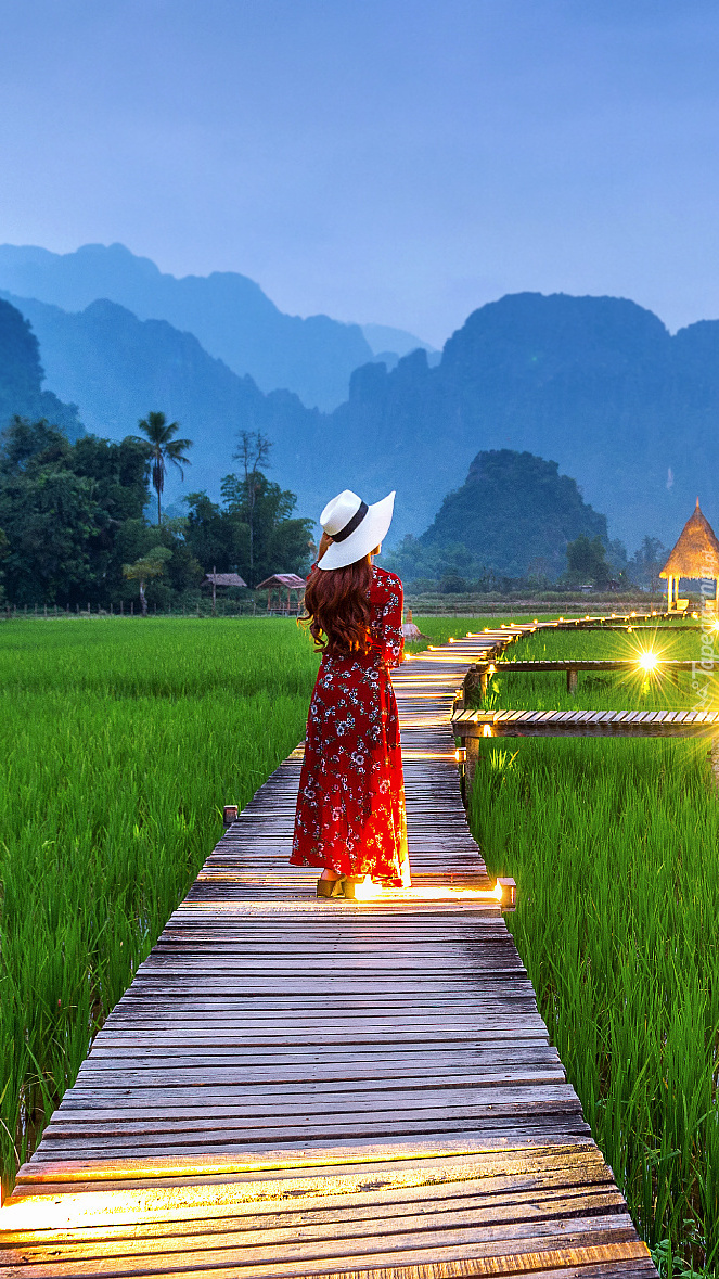 Edytor tapety: Dziewczyna w kapeluszu spacerująca po pomoście