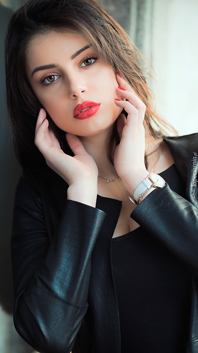 Edytor tapety: Zamyślona kobieta w skórzanej kurtce