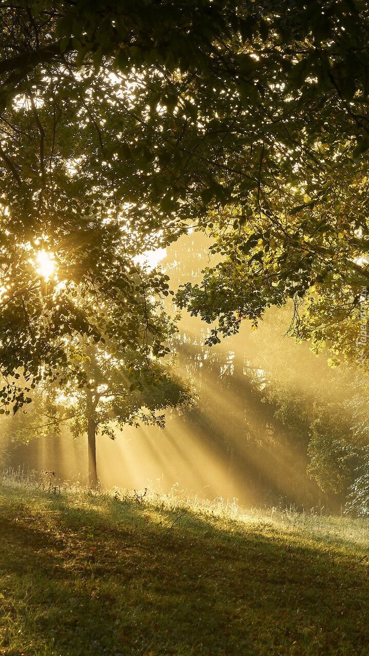 Edytor tapety: Promienie słońca w zamglonym lesie