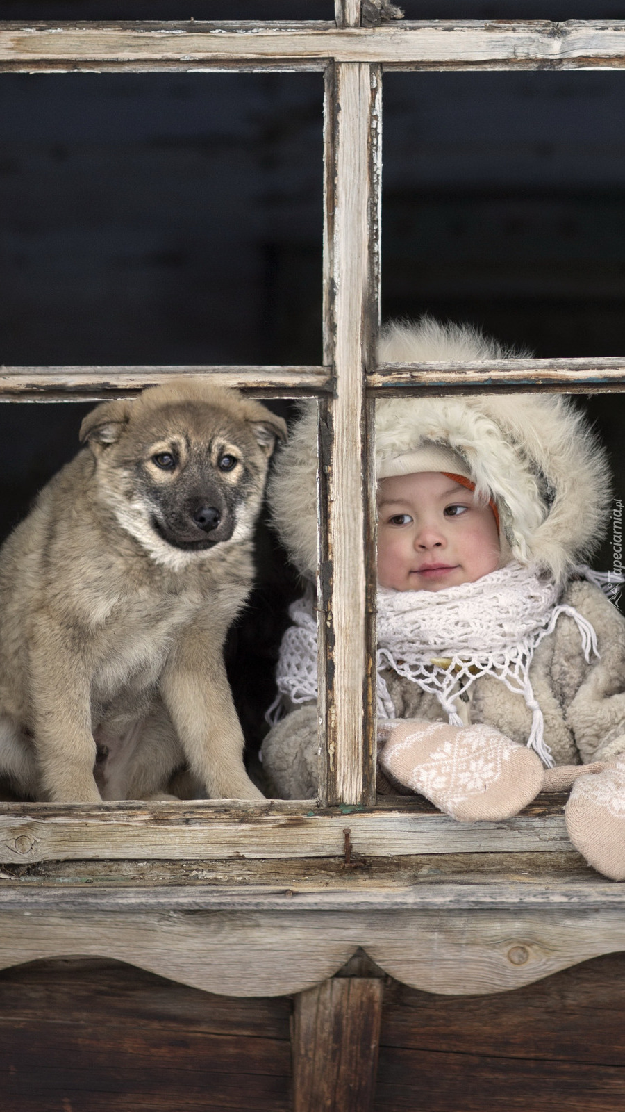Edytor tapety: Dziewczynka i pies przy oknie