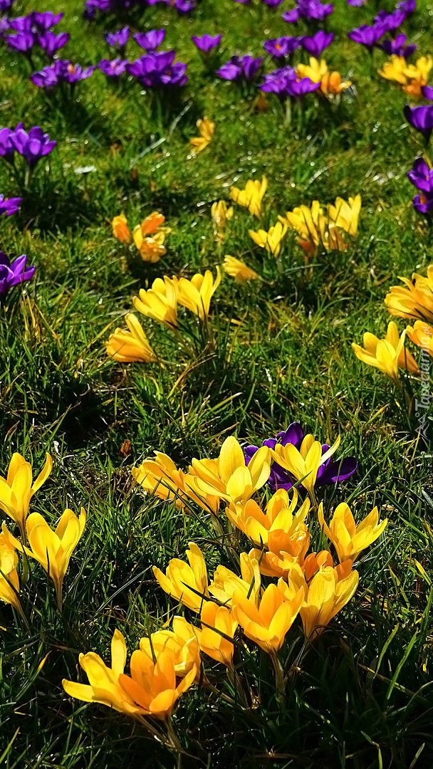Edytor tapety: Fioletowe i żółte krokusy w trawie