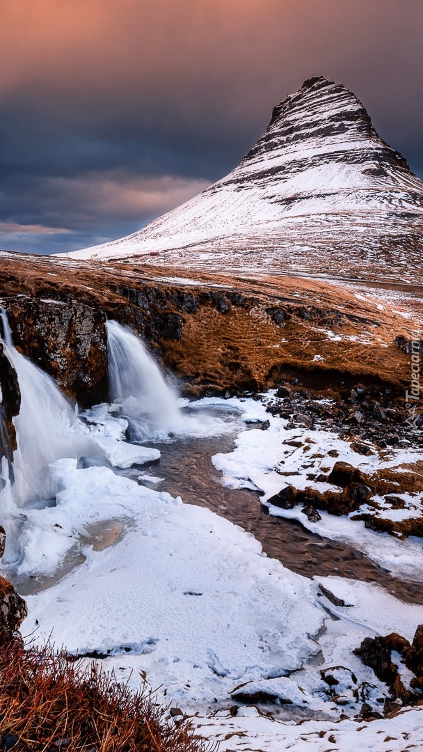 Edytor tapety: Ośnieżona góra Kirkjufell i wodospad Kirkjufellsfoss