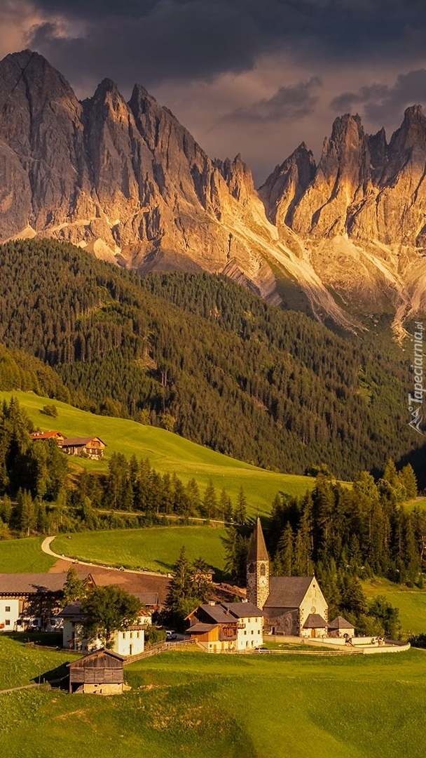 Edytor tapety: Kościół na tle rozświetlonego masywu Odle