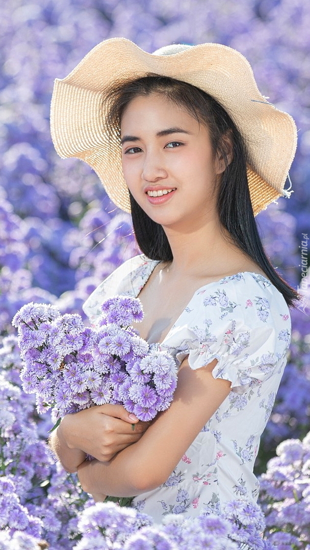 Edytor tapety: Azjatka z bukietem kwiatów