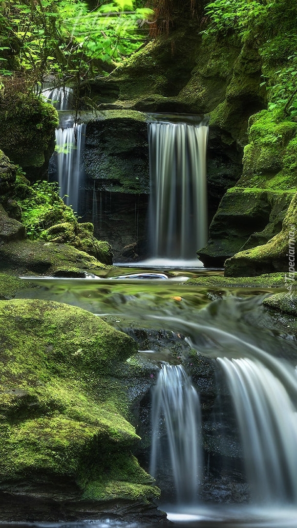 Edytor tapety: Wodospad na skałach w lesie