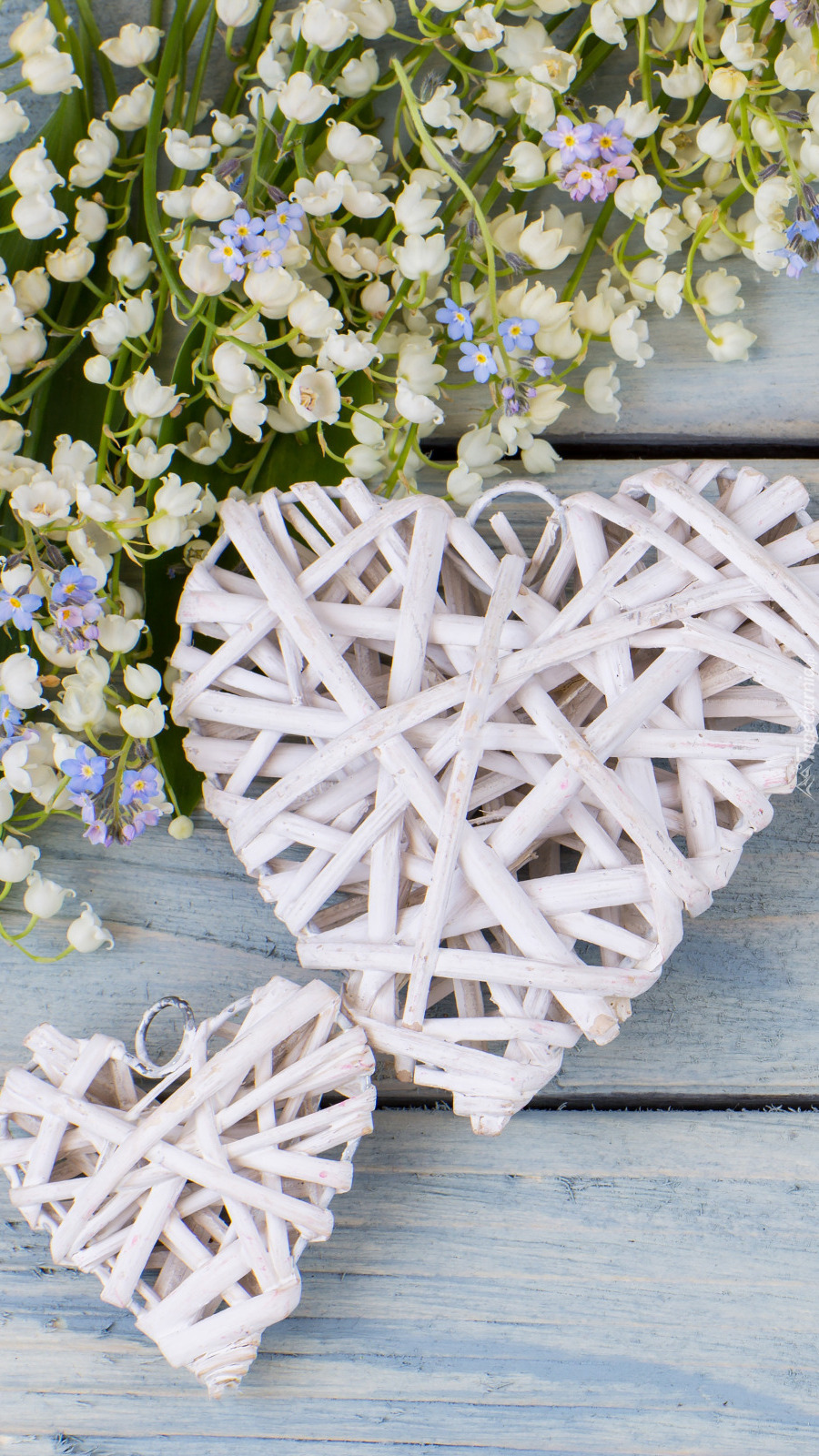 Edytor tapety: Konwalie i serca na deskach