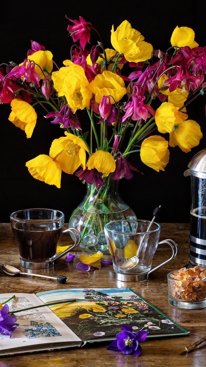 Edytor tapety: Orliki i żółte maki w wazonie