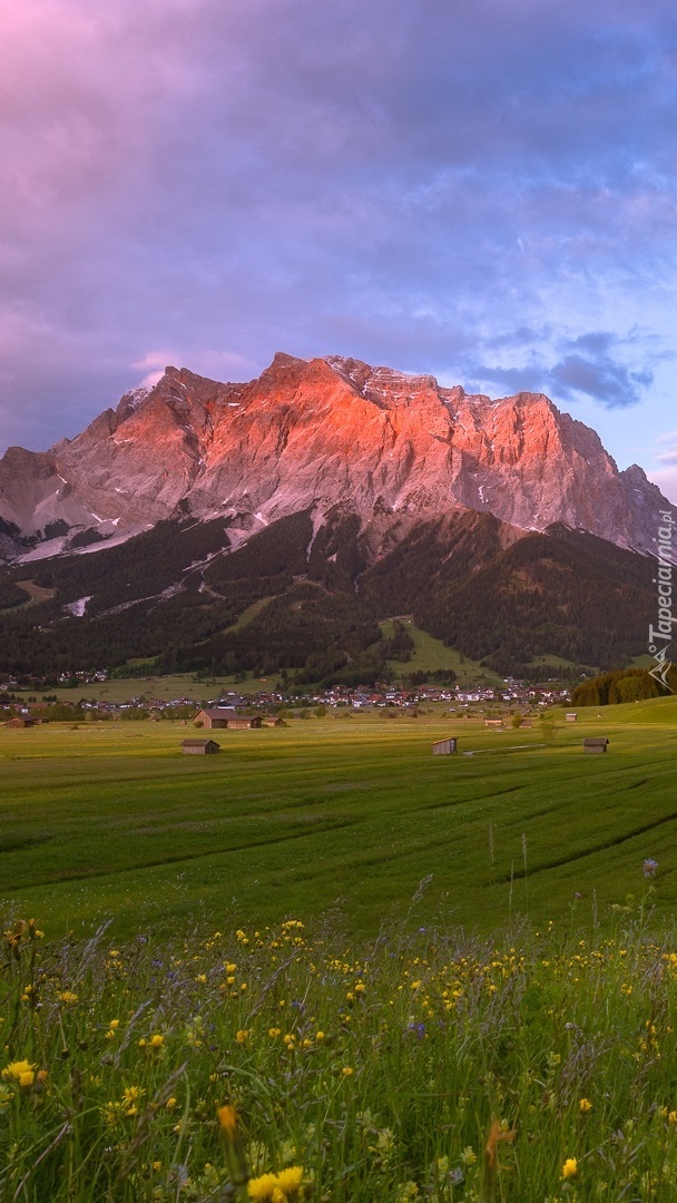 Edytor tapety: Widok z łąki na rozświetlone góry
