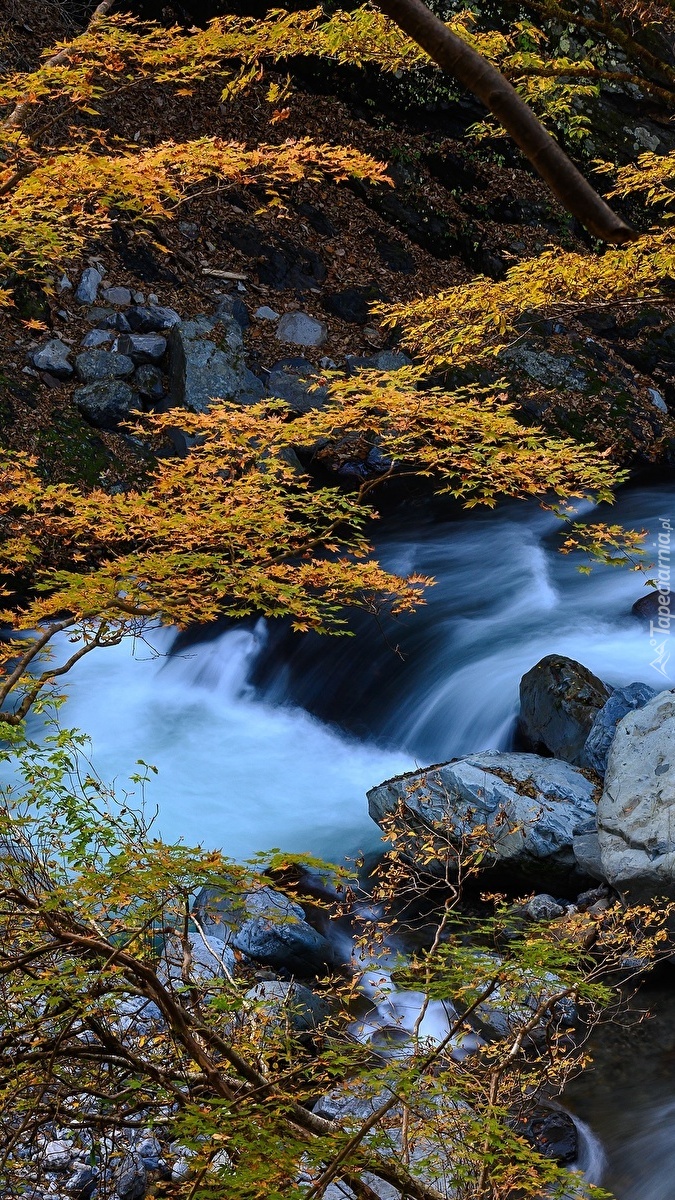 Edytor tapety: Pożółkłe drzewa nad rzeką w lesie
