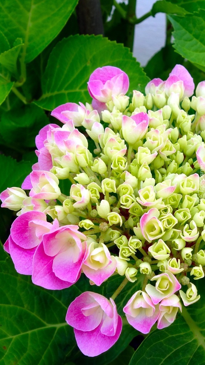 Edytor tapety: Rozkwitająca różowa hortensja