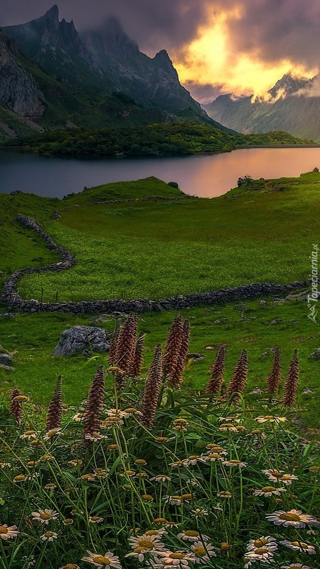 Edytor tapety: Kwiaty i łąka nad górskim jeziorem
