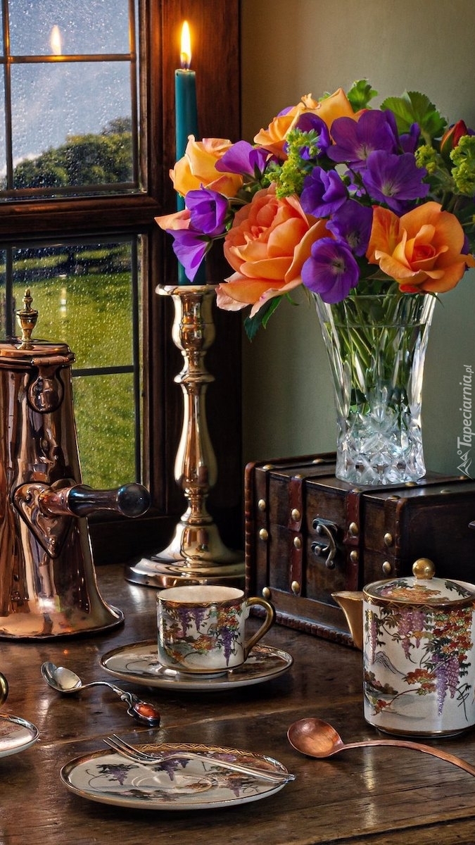 Edytor tapety: Świeca i kwiaty przy oknie