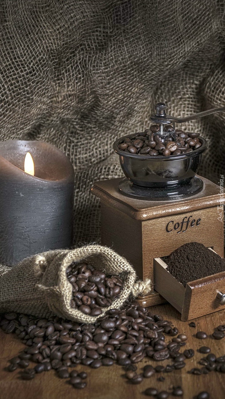 Edytor tapety: Ziarna kawy obok młynka