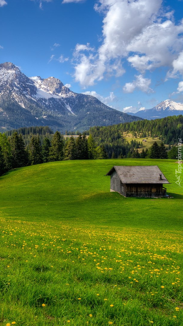 Edytor tapety: Drewniany dom na górskiej łące