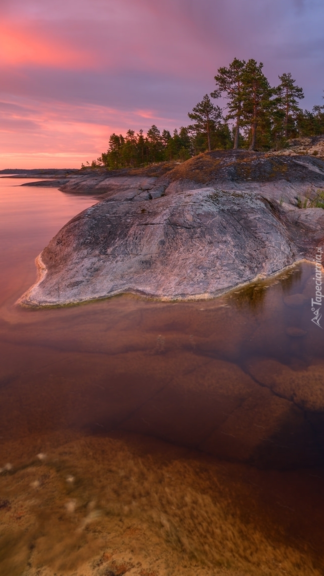 Edytor tapety: Drzewa na skałach nad jeziorem