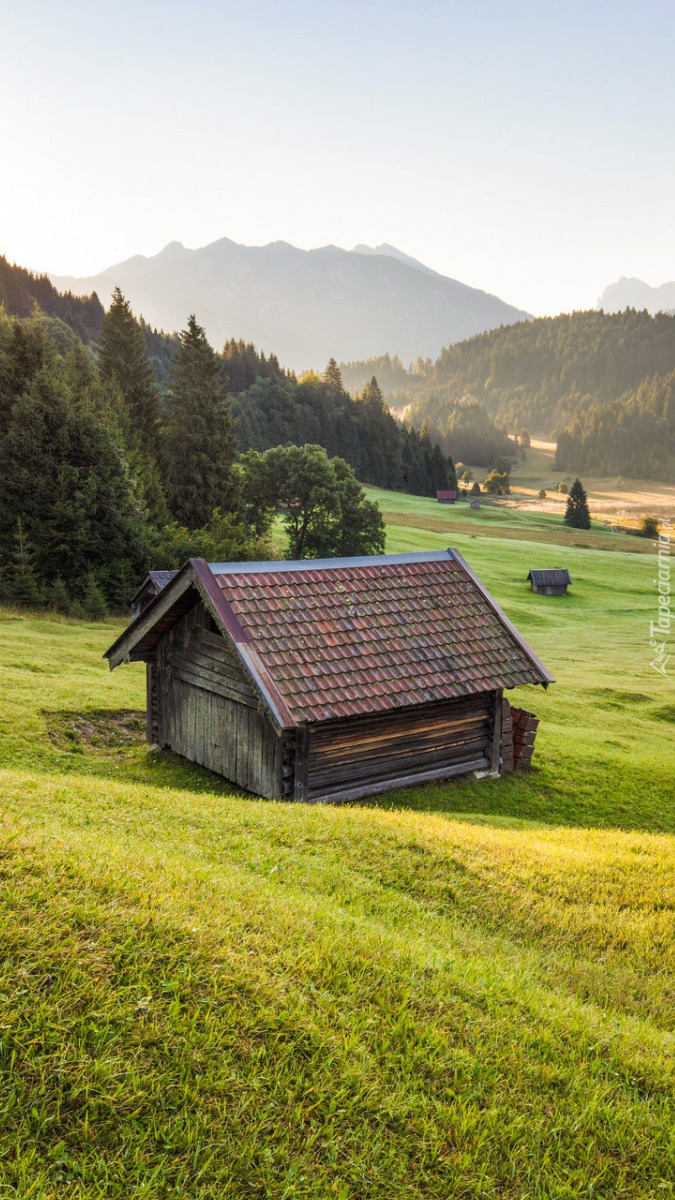 Edytor tapety: Drewniana szopa na górskiej polanie