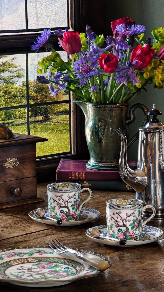 Edytor tapety: Bukiet kwiatów w dzbanku przy oknie