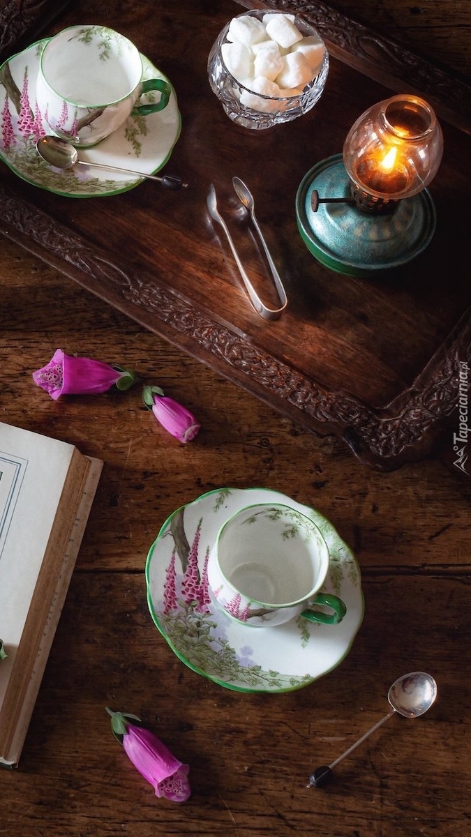 Edytor tapety: Porcelanowe filiżanki obok lampy
