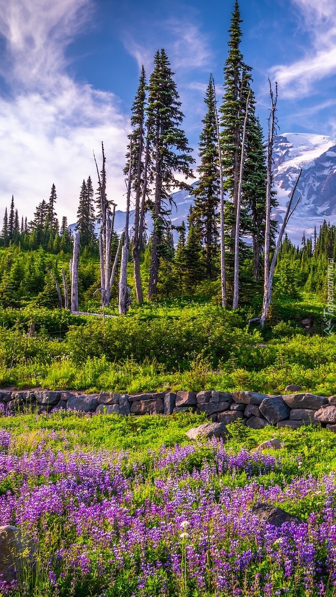Edytor tapety: Łubin i drzewa na górskiej łące