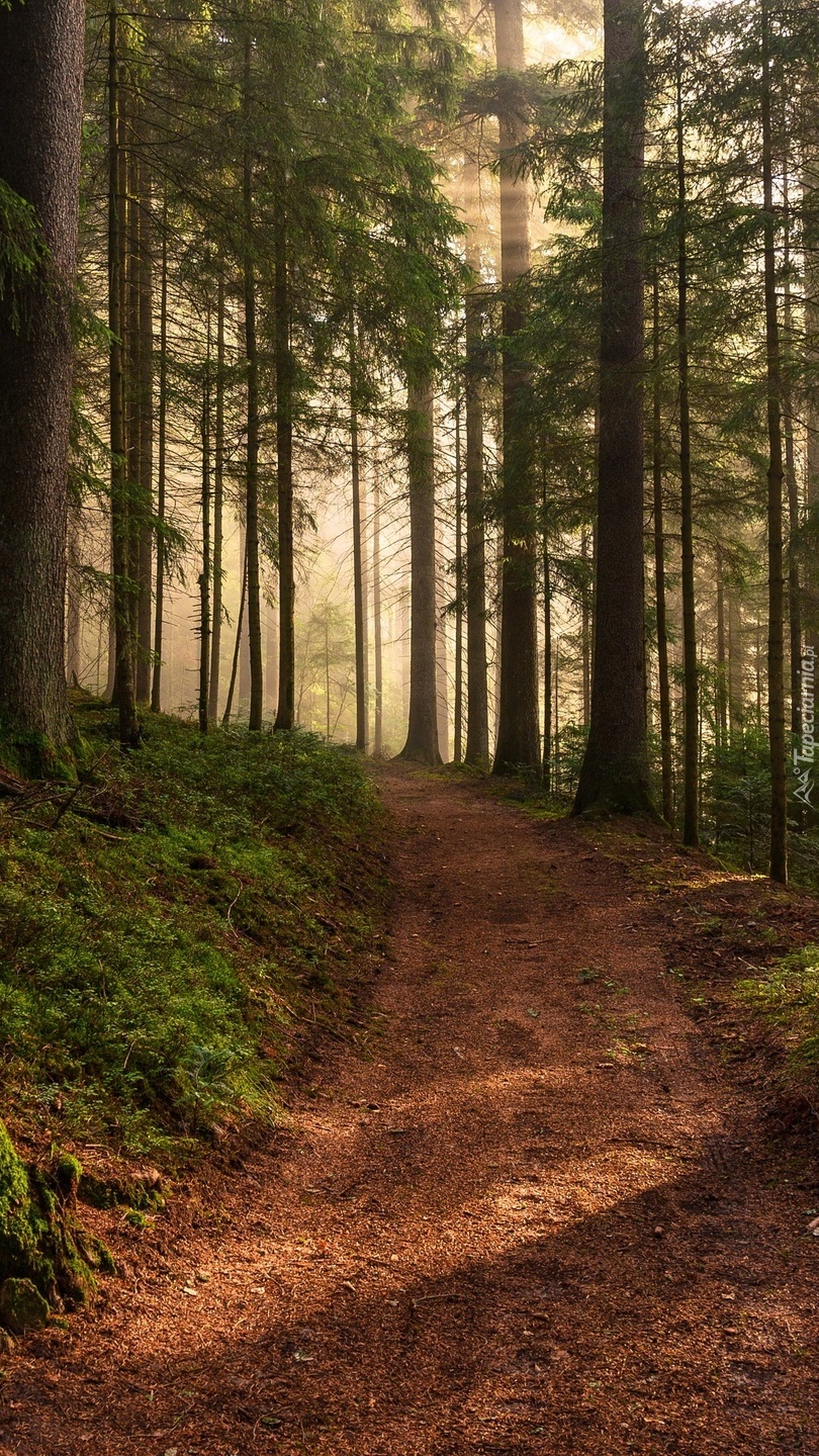 Edytor tapety: Rozświetlone drzewa i ścieżka w lesie