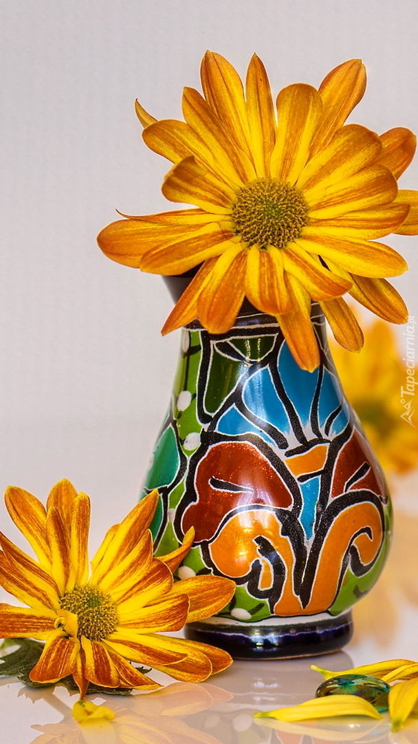 Edytor tapety: Żółty kwiat w kolorowym wazonie