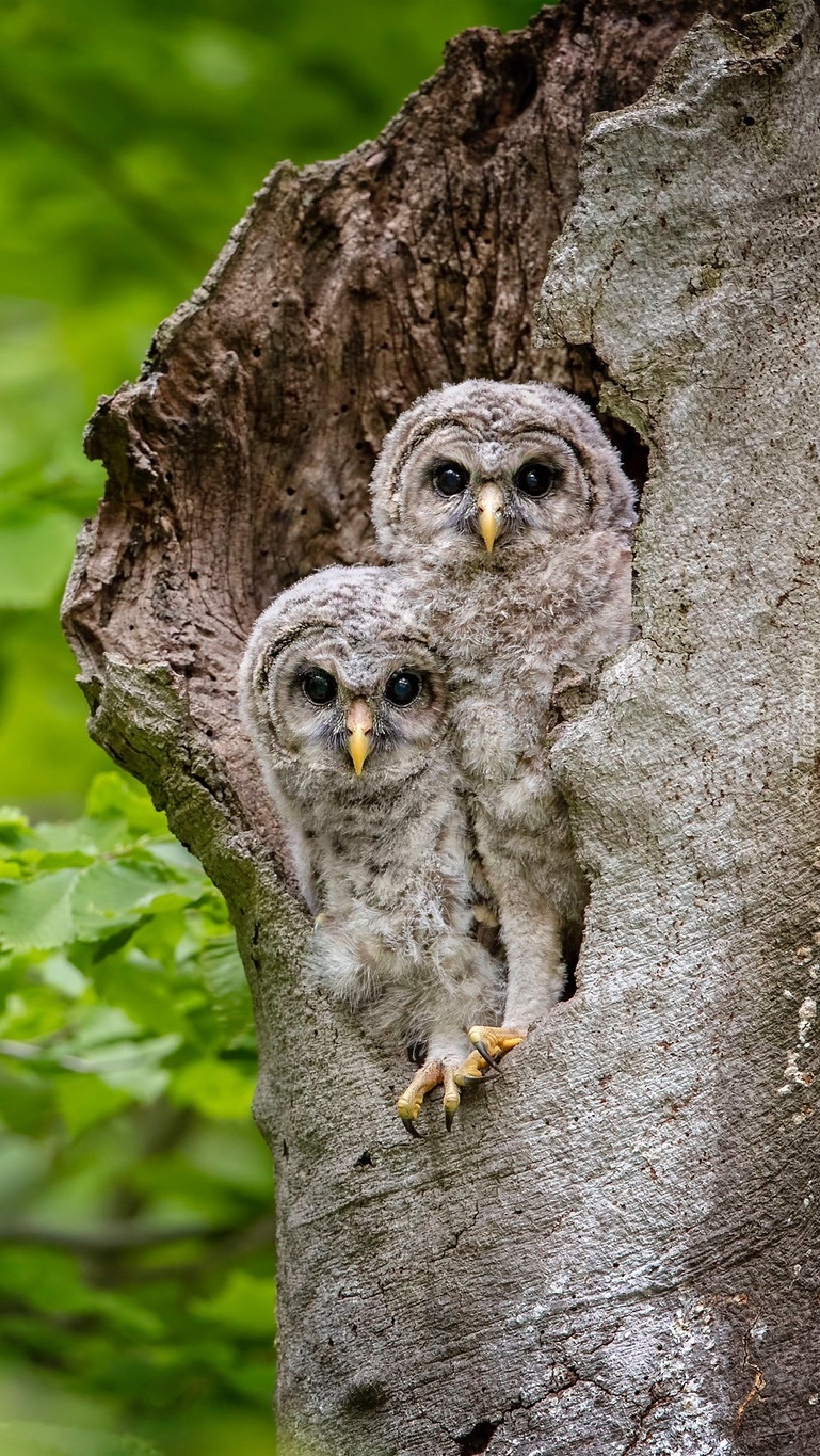 Edytor tapety: Dwa młode puszczyki w dziupli