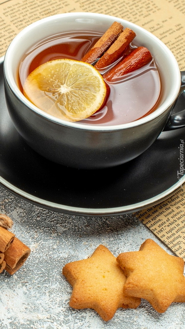 Edytor tapety: Ciasteczka obok herbaty w filiżance